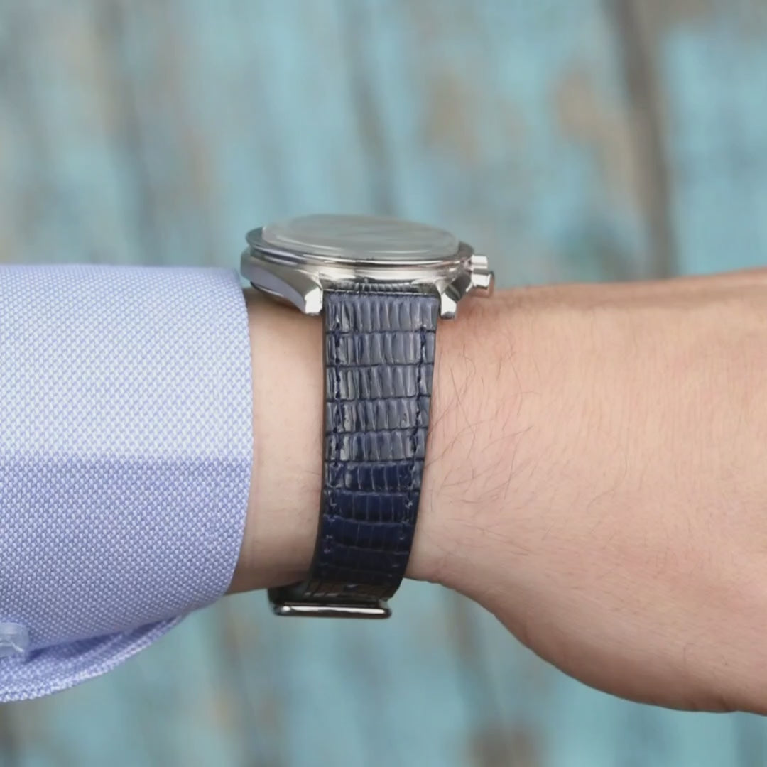 Deri Kordon; lacivert renkli gerçek kertenkele derisinden el işçiliği ile ustalarımız tarafından Ankara'da bulunan atölyemizde üretilmiştir. Arka tarafında uzun ömürlü olması için suya ve tere dayanıklı dana derisi kullanılmıştır.