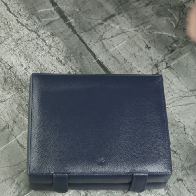 Saatlerinizi tek bir kutuda saklamak istiyorsanız deri ustalarımız tarafından üretilen dışı lacivert renkli gerçek dana derisi ve içi / yastıkları tarçın gerçek oğlak süet derisi Kişiselleştirilebilir Togo Saat Koleksiyon Kutularımız tam size göre.